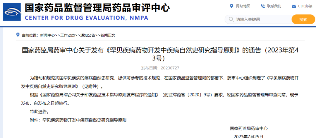 國家藥監(jiān)局藥審中心關(guān)于發(fā)布《罕見疾病藥物開發(fā)中疾病自然史研究指導(dǎo)原則》的通告(2023年第43號(hào))