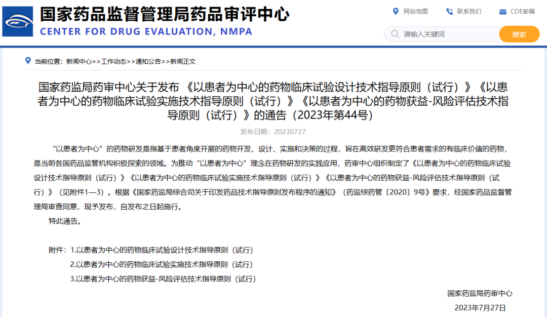 國家藥監(jiān)局藥審中心關(guān)于發(fā)布 《以患者為中心的藥物臨床試驗(yàn)設(shè)計(jì)技術(shù)指導(dǎo)原則(試行)》《以患者為中心的藥物臨床試驗(yàn)實(shí)施技術(shù)指導(dǎo)原則(試行)》《以患者為中心的藥物獲益-風(fēng)險(xiǎn)評(píng)估技術(shù)指導(dǎo)原則(試行)》的通告(2023年第44號(hào))
