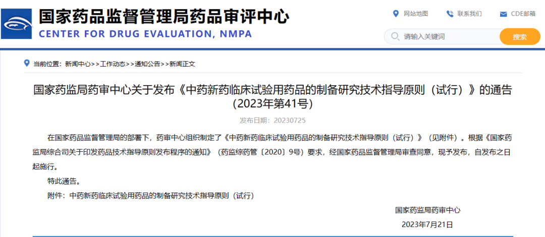 國家藥監(jiān)局藥審中心關(guān)于發(fā)布《中藥新藥臨床試驗(yàn)用藥品的制備研究技術(shù)指導(dǎo)原則(試行)》的通告(2023年第41號(hào))