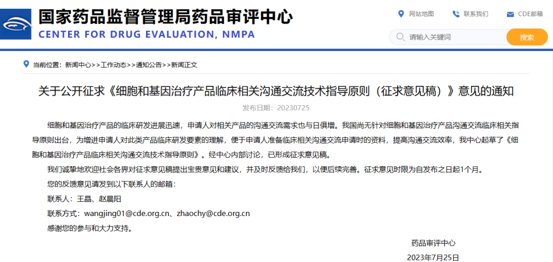關(guān)于公開征求《細(xì)胞和基因治療產(chǎn)品臨床相關(guān)溝通交流技術(shù)指導(dǎo)原則(征求意見稿)》意見的通知