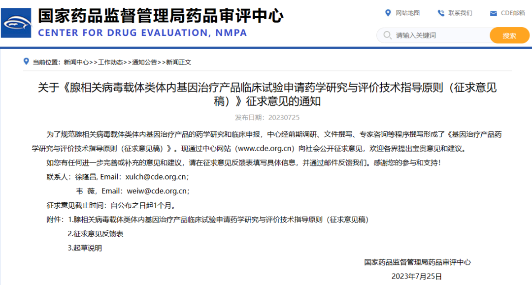 關(guān)于《腺相關(guān)病毒載體類體內(nèi)基因治療產(chǎn)品臨床試驗(yàn)申請(qǐng)藥學(xué)研究與評(píng)價(jià)技術(shù)指導(dǎo)原則(征求意見稿)》征求意見的通知