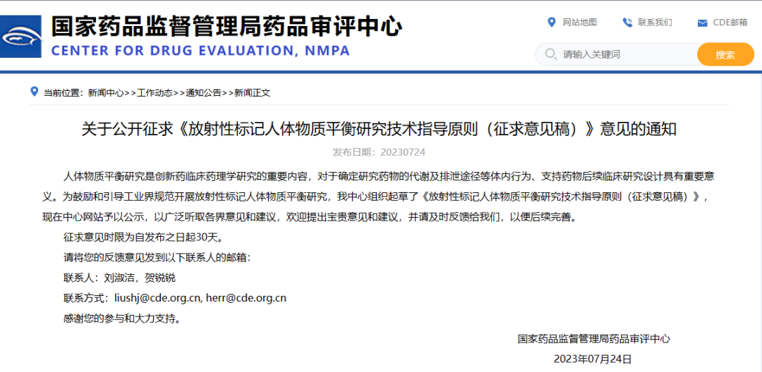關(guān)于公開征求《放射性標(biāo)記人體物質(zhì)平衡研究技術(shù)指導(dǎo)原則(征求意見稿)》意見的通知