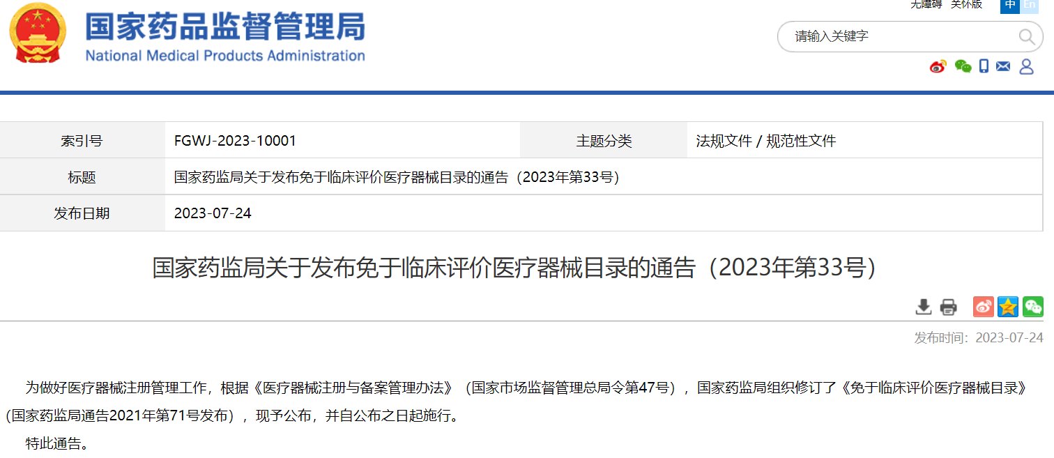 國家藥監(jiān)局關(guān)于發(fā)布免于臨床評(píng)價(jià)醫(yī)療器械目錄的通告(2023年第33號(hào))