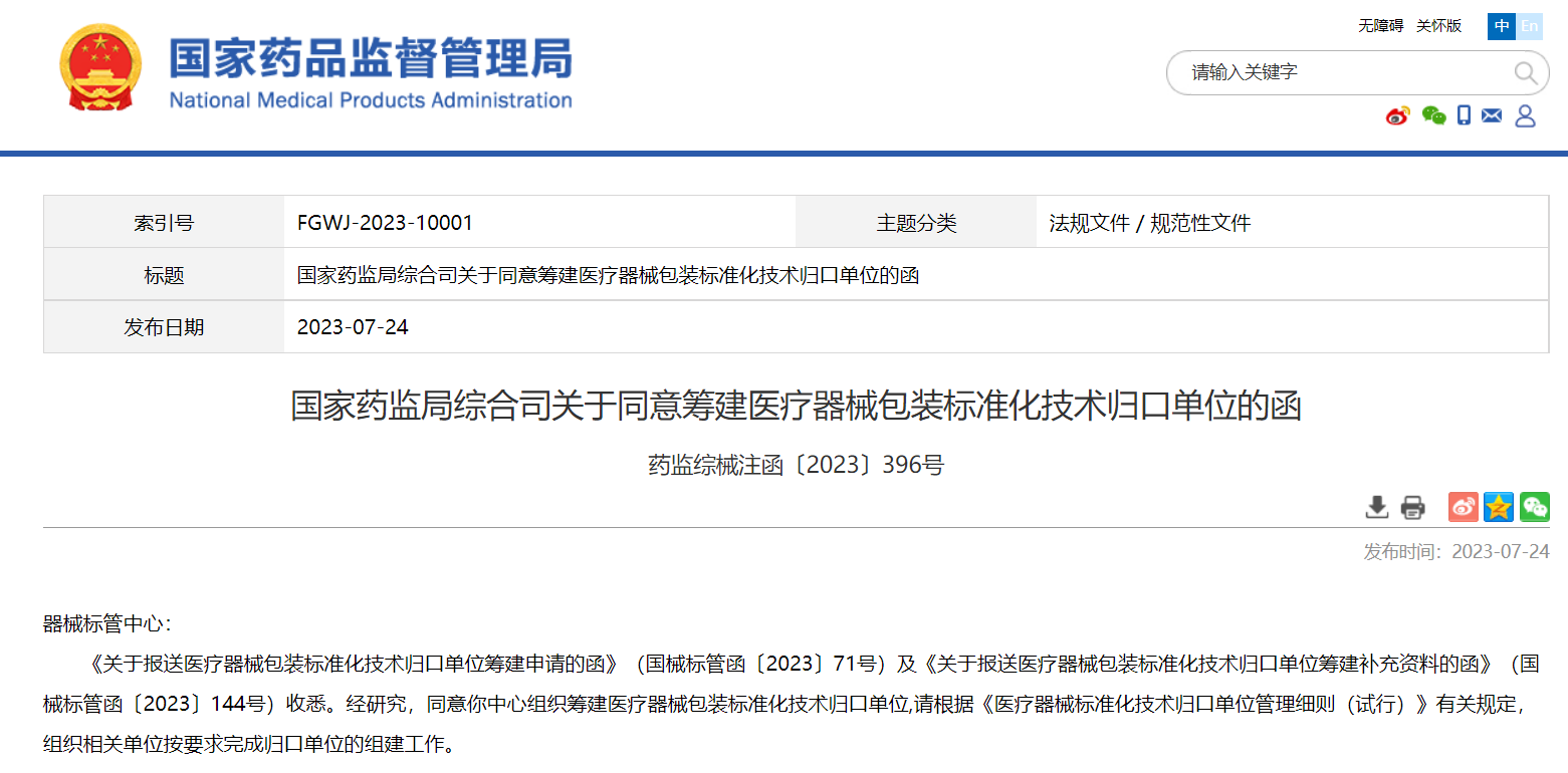 國家藥監(jiān)局綜合司關(guān)于同意籌建醫(yī)療器械包裝標(biāo)準(zhǔn)化技術(shù)歸口單位的函