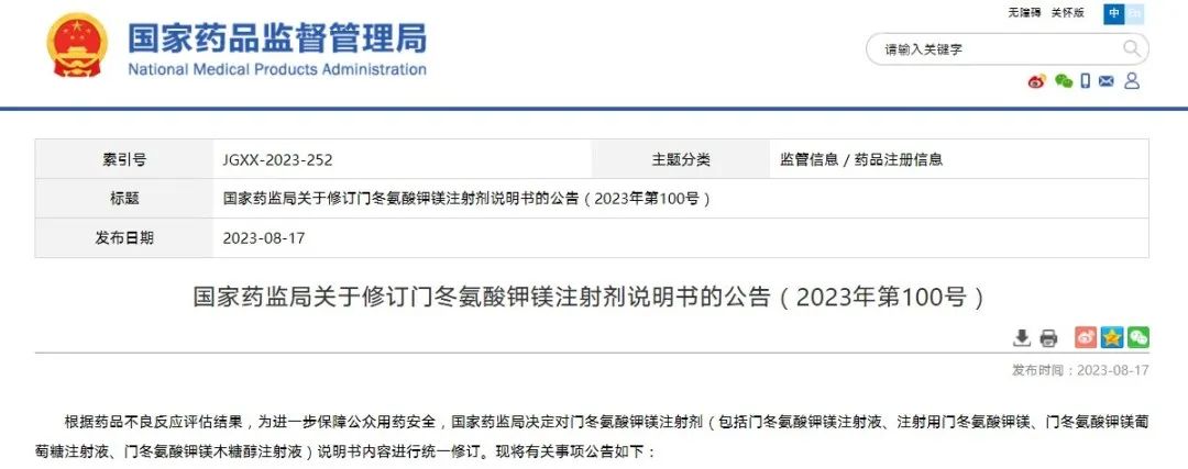 國(guó)家藥監(jiān)局關(guān)于修訂門冬氨酸鉀鎂注射劑說明書的公告(2023年第100號(hào))
