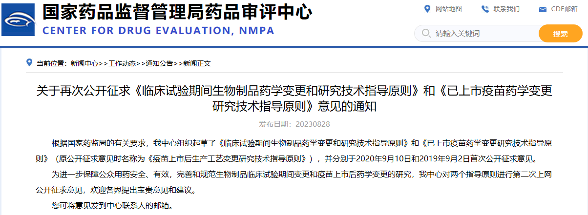 關(guān)于再次公開(kāi)征求《臨床試驗(yàn)期間生物制品藥學(xué)變更和研究技術(shù)指導(dǎo)原則》和《已上市疫苗藥學(xué)變更研究技術(shù)指導(dǎo)原則》意見(jiàn)的通知