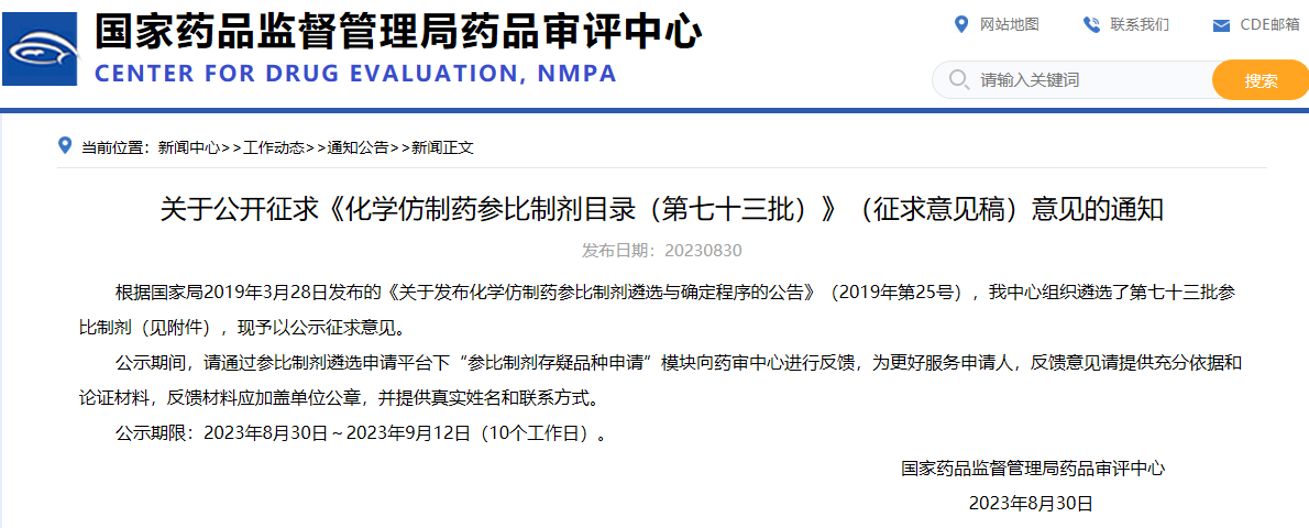 關(guān)于公開(kāi)征求《化學(xué)仿制藥參比制劑目錄(第七十三批)》(征求意見(jiàn)稿)意見(jiàn)的通知