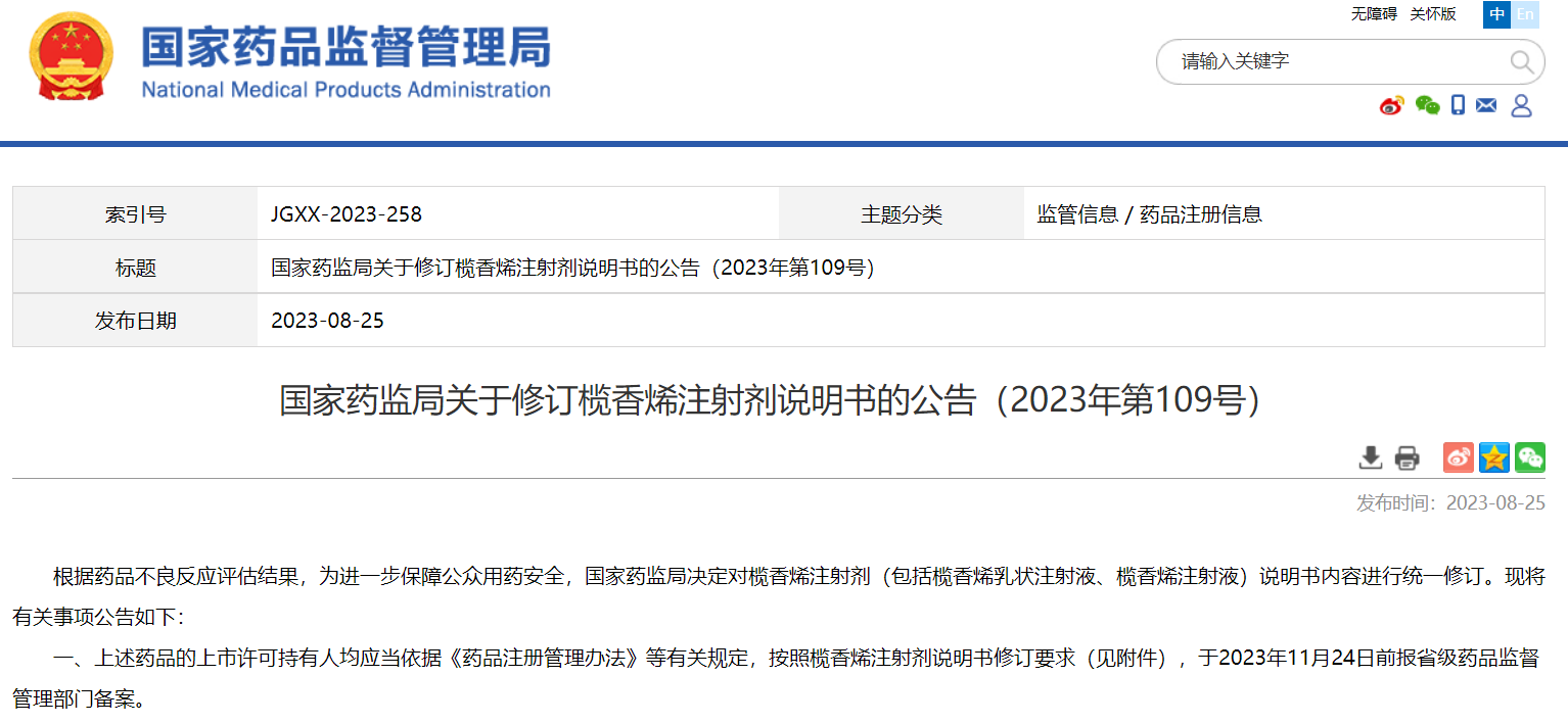 國(guó)家藥監(jiān)局關(guān)于修訂欖香烯注射劑說(shuō)明書(shū)的公告(2023年第109號(hào))