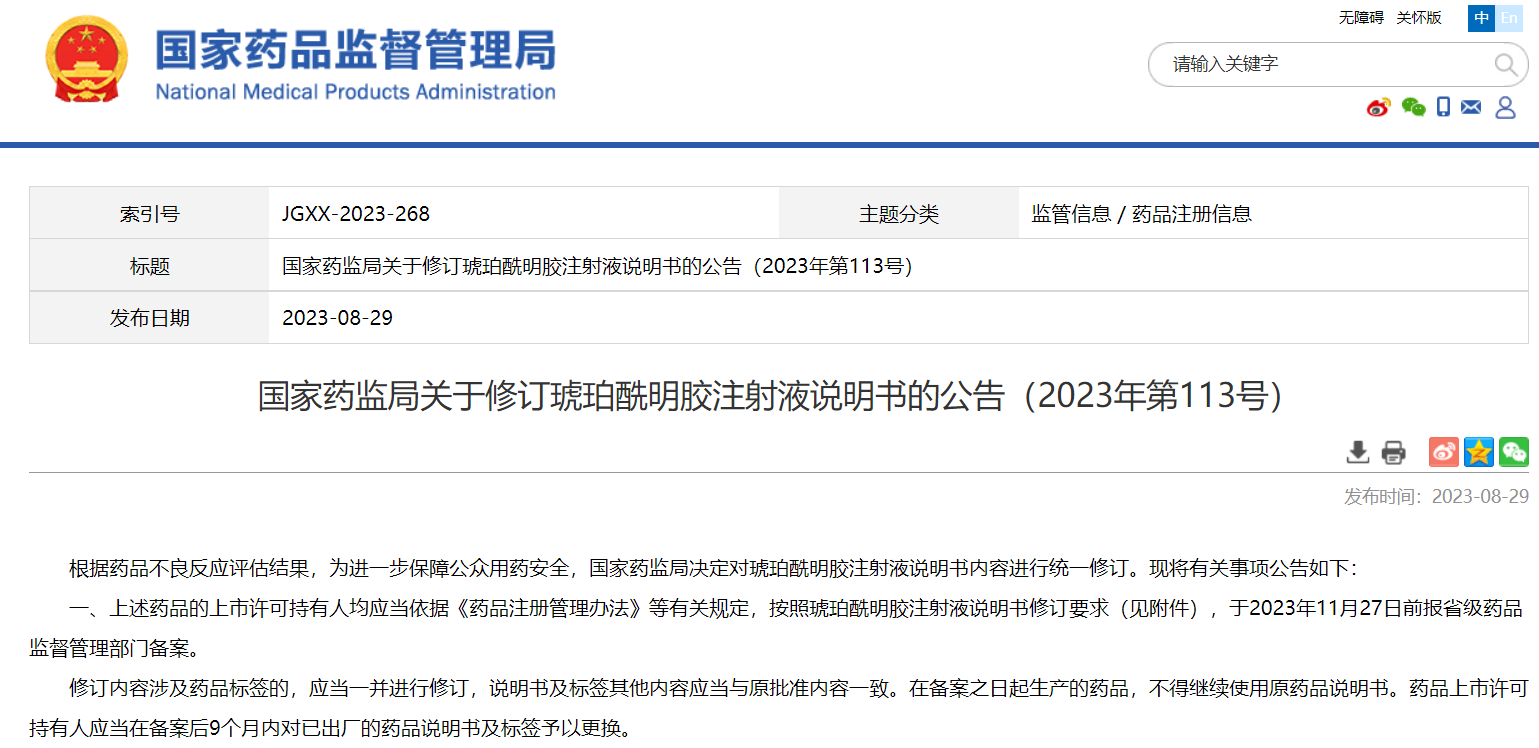 國(guó)家藥監(jiān)局關(guān)于修訂琥珀酰明膠注射液說(shuō)明書(shū)的公告(2023年第113號(hào))