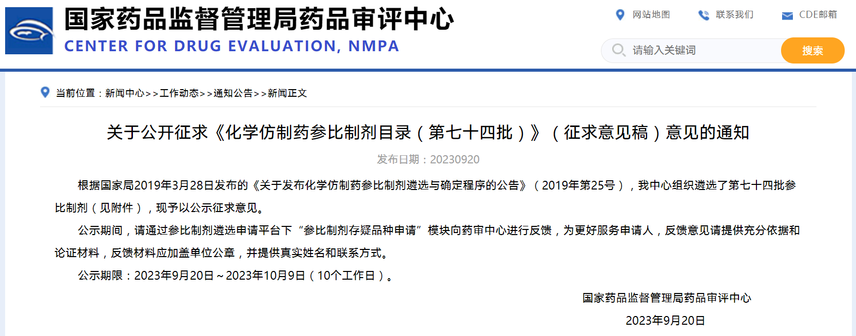 關(guān)于公開(kāi)征求《化學(xué)仿制藥參比制劑目錄(第七十四批)》(征求意見(jiàn)稿)意見(jiàn)的通知