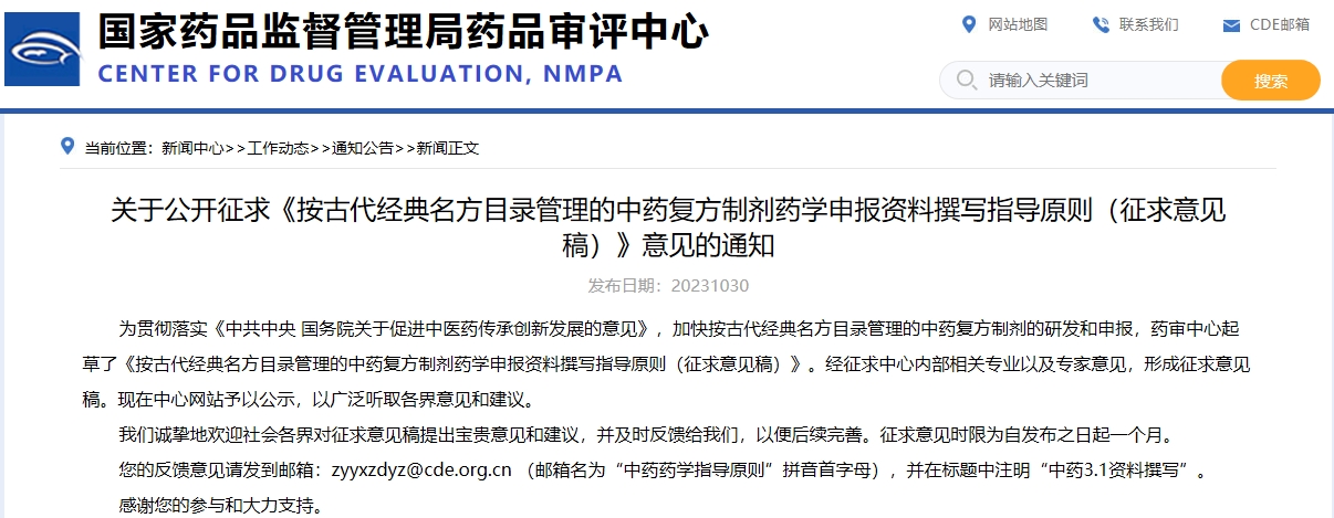 關(guān)于公開征求《按古代經(jīng)典名方目錄管理的中藥復(fù)方制劑藥學(xué)申報資料撰寫指導(dǎo)原則(征求意見稿)》意見的通知