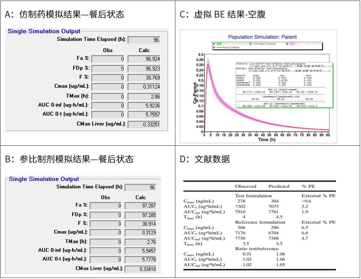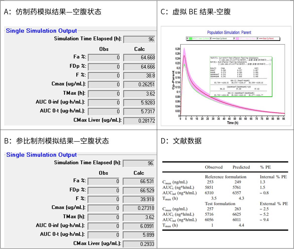 參考文獻數(shù)據(jù),仿制藥的Z-factor數(shù)據(jù)為0.131,參比制劑Z-factor值為0.205,模擬經(jīng)驗Z-factor值越高,模擬結果越高,即參比吸收要比仿制藥好,新領先模擬結果具有該趨勢??赡苡捎谀P椭袛?shù)據(jù)缺乏,我方模擬趨勢與文獻趨勢相反。