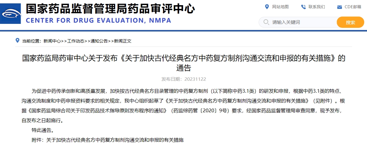 國(guó)家藥監(jiān)局藥審中心關(guān)于發(fā)布《關(guān)于加快古代經(jīng)典名方中藥復(fù)方制劑溝通交流和申報(bào)的有關(guān)措施》的通告