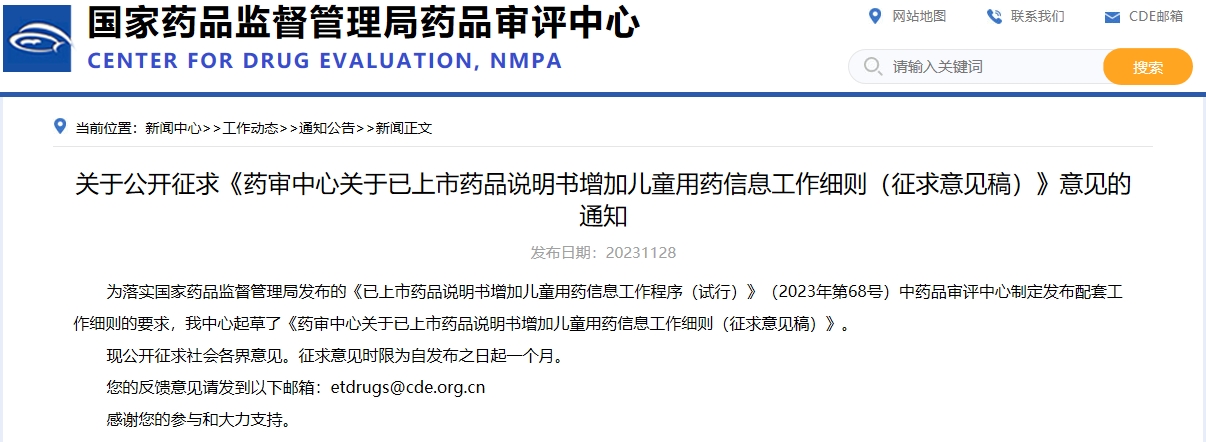 關(guān)于公開征求《藥審中心關(guān)于已上市藥品說明書增加兒童用藥信息工作細(xì)則(征求意見稿)》意見的通知