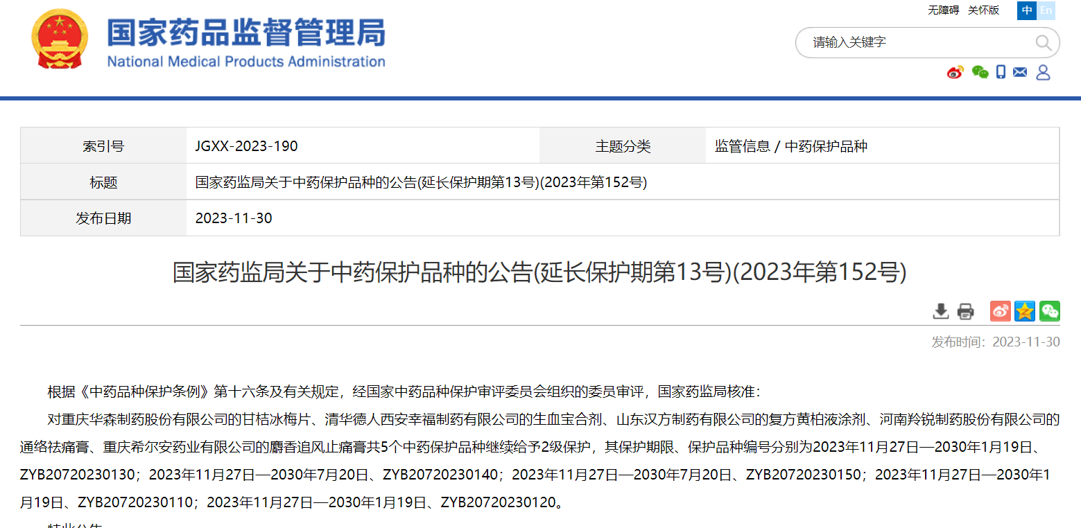 國(guó)家藥監(jiān)局關(guān)于中藥保護(hù)品種的公告(延長(zhǎng)保護(hù)期第13號(hào))(2023年第152號(hào))