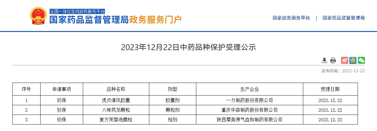 2023年12月22日中藥品種保護(hù)受理公示
