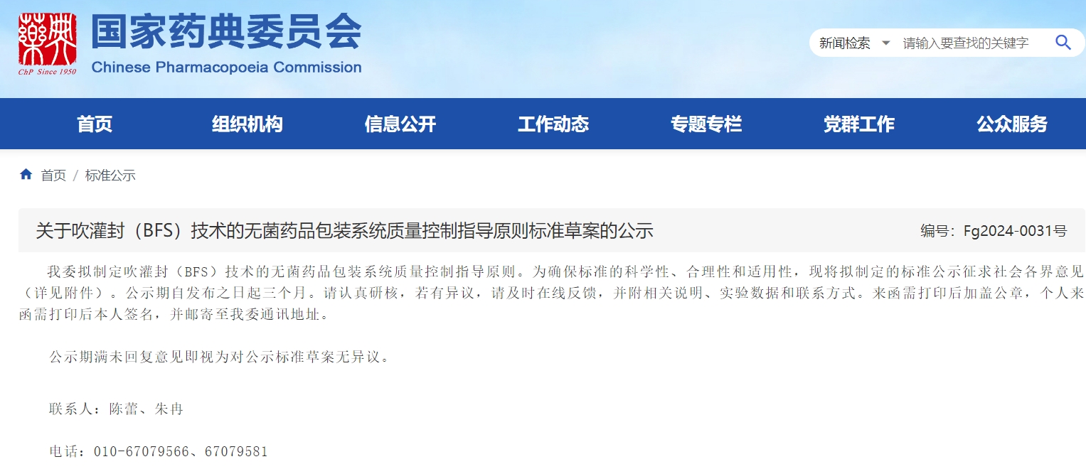 關(guān)于吹灌封(BFS)技術(shù)的無菌藥品包裝系統(tǒng)質(zhì)量控制指導(dǎo)原則標(biāo)準(zhǔn)草案的公示