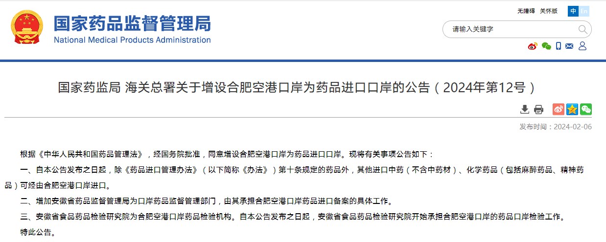 國(guó)家藥監(jiān)局 海關(guān)總署關(guān)于增設(shè)合肥空港口岸為藥品進(jìn)口口岸的公告(2024年第12號(hào))