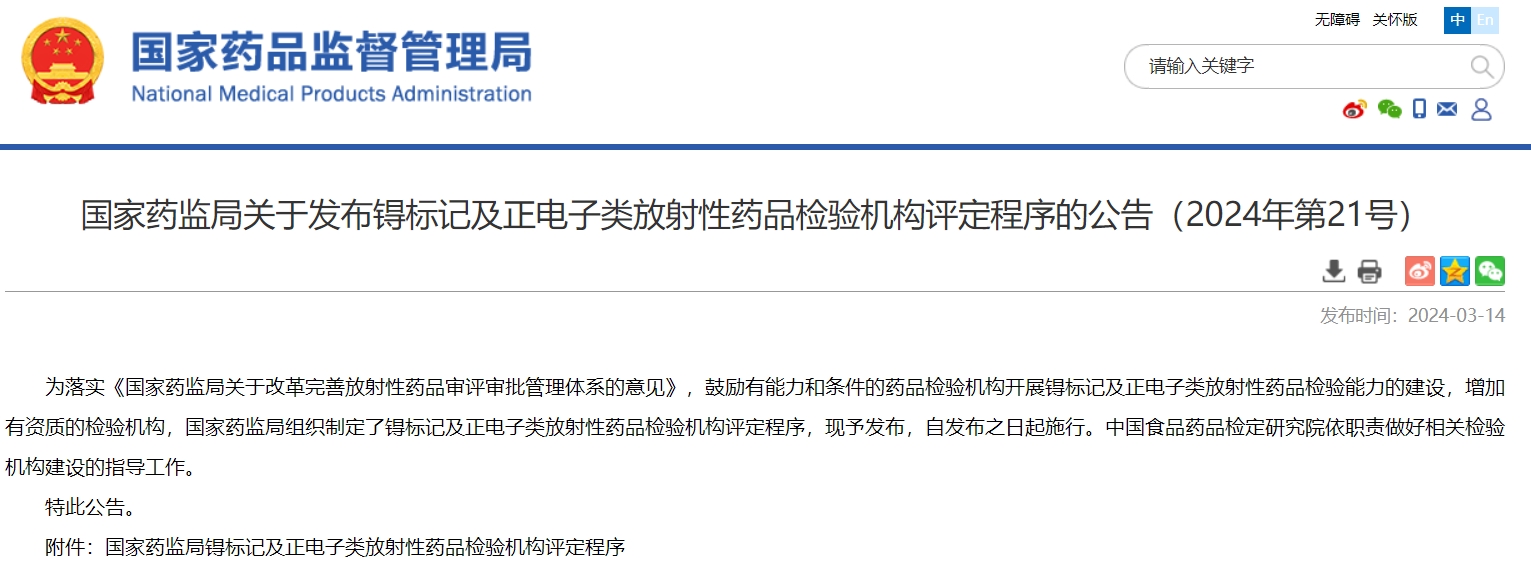 國家藥監(jiān)局關(guān)于發(fā)布锝標(biāo)記及正電子類放射性藥品檢驗(yàn)機(jī)構(gòu)評(píng)定程序的公告(2024年第21號(hào))
