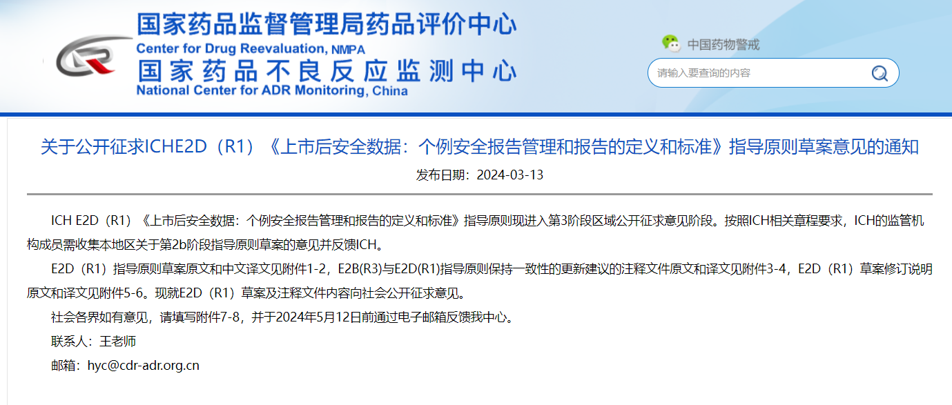 關(guān)于公開征求ICHE2D(R1)《上市后安全數(shù)據(jù):個(gè)例安全報(bào)告管理和報(bào)告的定義和標(biāo)準(zhǔn)》指導(dǎo)原則草案意見的通知
