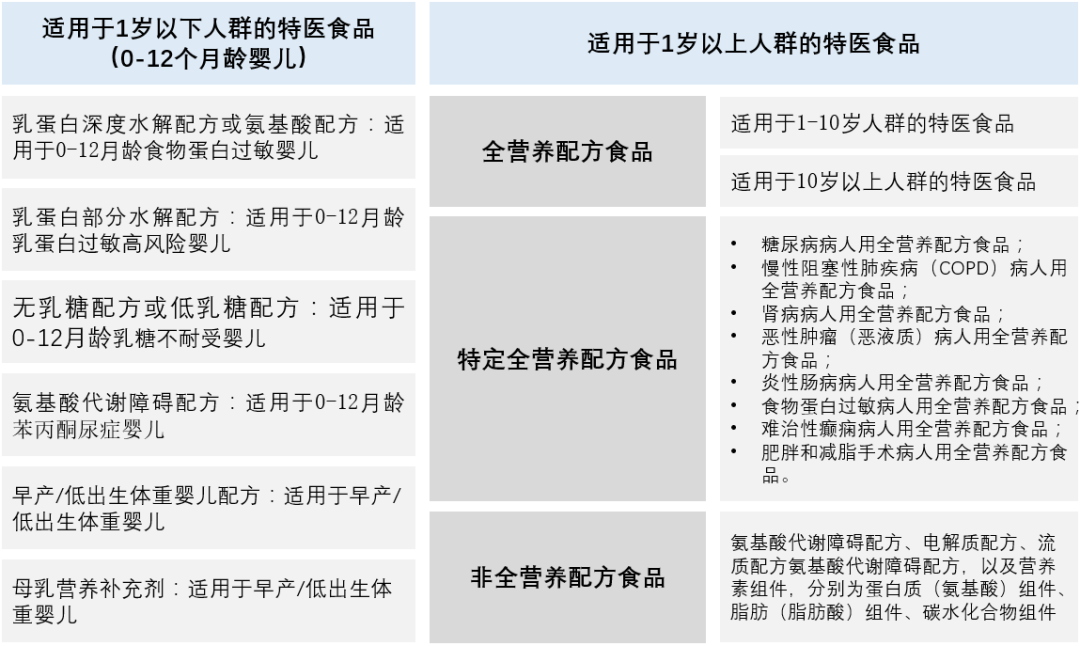 特殊醫(yī)學(xué)用途配方食品分為供1歲以下嬰兒食用的特殊醫(yī)學(xué)用途嬰兒配方食品和供1歲以上人群食用的特殊醫(yī)學(xué)用途配方食品。適用于1歲以上人群的特醫(yī)食品又分為全營(yíng)養(yǎng)配方食品、特定全營(yíng)養(yǎng)配方食品和非全營(yíng)養(yǎng)配方食品。