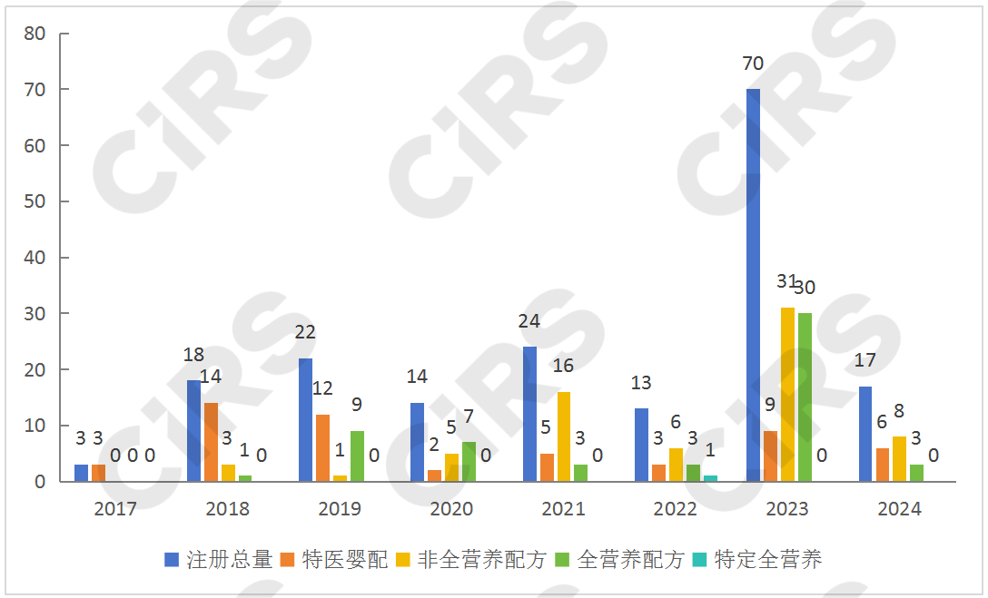 自2017年第一款特醫(yī)嬰配產(chǎn)品注冊(cè)成功后,特醫(yī)食品注冊(cè)大門正式打開。下圖可知,特醫(yī)嬰配呈現(xiàn)高開低走的趨勢(shì),其注冊(cè)主要集中于2018年和2019年,非全營(yíng)養(yǎng)配方的注冊(cè)則集中于2021和2023年。2022年總注冊(cè)量較少,但注冊(cè)產(chǎn)品類型增多,且新增了首款特定全營(yíng)養(yǎng)配方食品。2023年新增了首款增稠組件,注冊(cè)類型主要集中于全營(yíng)養(yǎng)和非全營(yíng)養(yǎng)產(chǎn)品,其占比高達(dá)87%。相比2022年注冊(cè)量,2023年呈現(xiàn)爆發(fā)式增長(zhǎng)。2024年第一季度已新增17款產(chǎn)品,由此可見2024年的產(chǎn)品獲批勢(shì)頭強(qiáng)勁,而特定全營(yíng)養(yǎng)食品依然是需要繼續(xù)突破的大關(guān)。