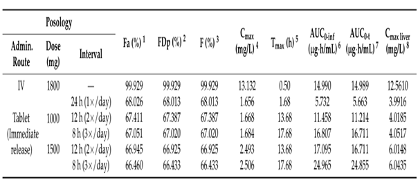 所有口服給藥的研究方案中所預(yù)測的Cmax均低于靜脈推注的結(jié)果(模擬最大的Cmax為2.496mg/L,為每日三次給藥1500mg片劑后預(yù)測值)。