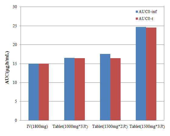 圖1 靜脈推注1800mg、1000片3次/天與1500mg片2次/天、3次/天的AUC比較