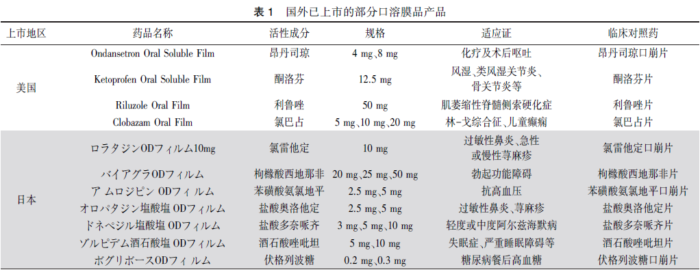 2006年,日本上市了第一個口溶膜處方藥伏格列波糖口溶膜。2010年,美國和歐洲分別上市第一個口溶膜處方藥昂丹司瓊口溶膜(Rapidfilm和Setofilm)。2020年,國家藥品監(jiān)督管理局批準了第一個口溶膜化學藥品奧氮平口溶膜上市。目前,全球已有多個口溶膜產(chǎn)品上市,查詢美國、歐洲、日本藥品監(jiān)管機構網(wǎng)站,部分品種信息見表1。