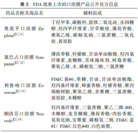 調(diào)研美國食品藥品監(jiān)督管理局(Food and Drug Administration,F(xiàn)DA)批準上市的口溶膜處方如表3所示。其中羥丙甲纖維素、羥丙基纖維素為常用的成膜材料,甘油、甘油單油酸酯為常用的增塑劑,三氯蔗糖、香精為常用的矯味劑。