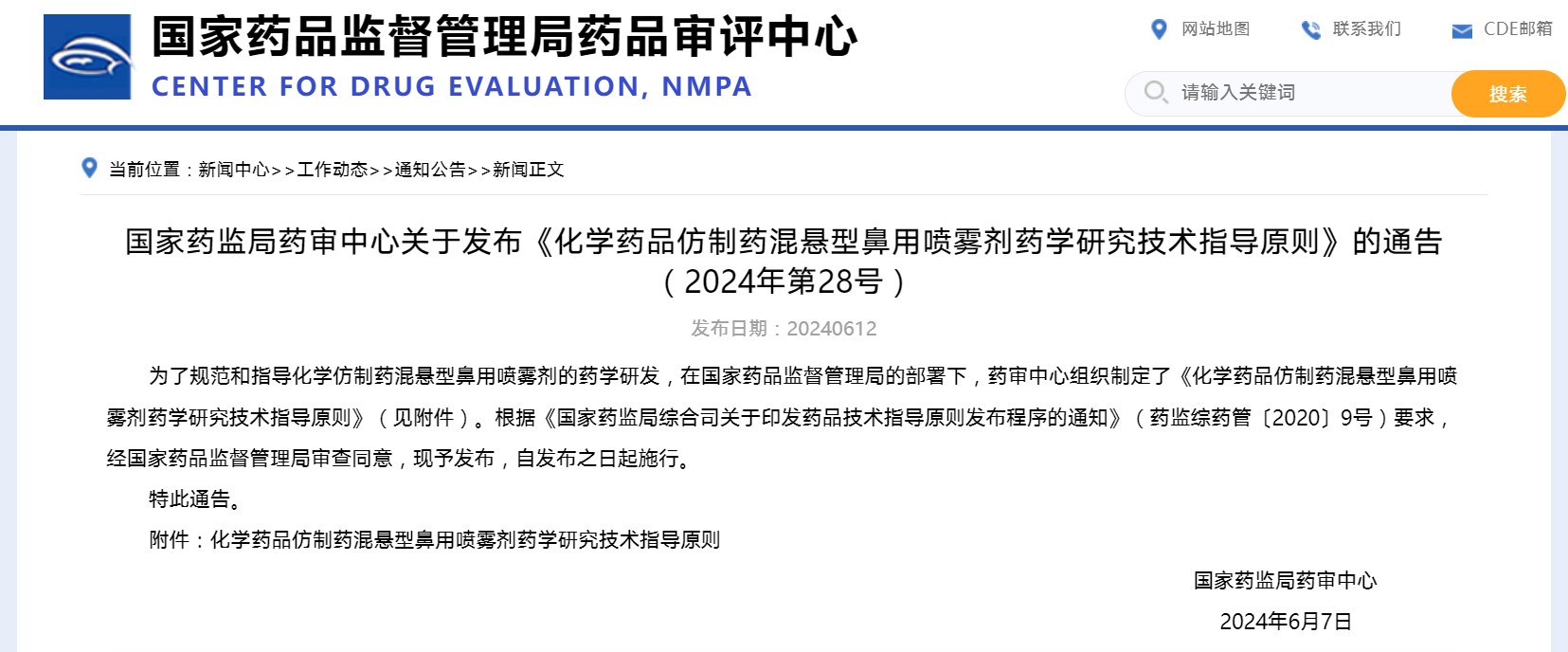 國(guó)家藥監(jiān)局藥審中心關(guān)于發(fā)布《化學(xué)藥品仿制藥混懸型鼻用噴霧劑藥學(xué)研究技術(shù)指導(dǎo)原則》的通告(2024年第28號(hào))
