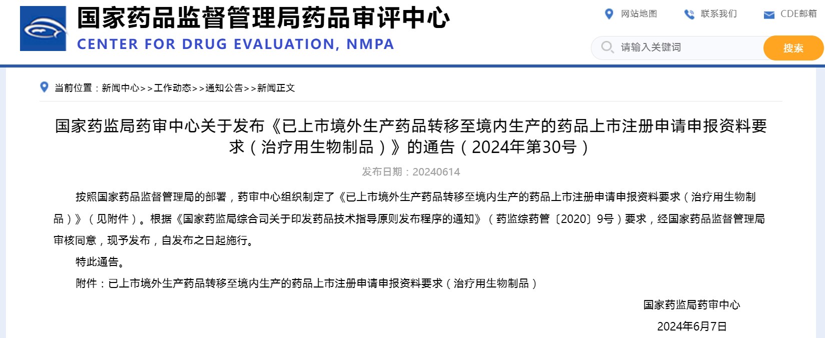 國(guó)家藥監(jiān)局藥審中心關(guān)于發(fā)布《已上市境外生產(chǎn)藥品轉(zhuǎn)移至境內(nèi)生產(chǎn)的藥品上市注冊(cè)申請(qǐng)申報(bào)資料要求(治療用生物制品)》的通告(2024年第30號(hào))