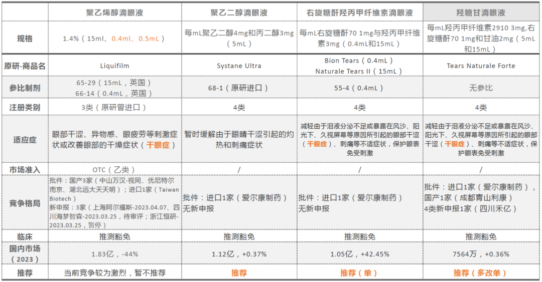 建議開發(fā)改善安全性的0.01%/0.15%滴眼液、低濃度0.025眼部紅腫產(chǎn)品、復(fù)方制劑,持續(xù)關(guān)注醫(yī)美外用凝膠進(jìn)口動向。