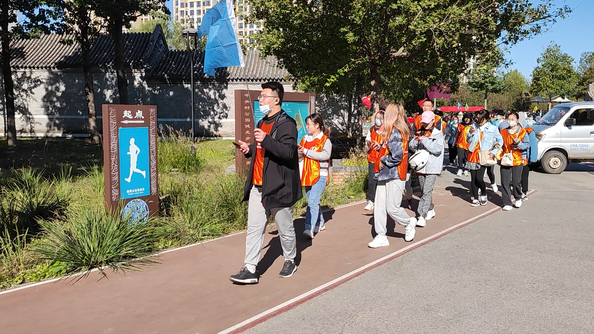 ▲ All team members hold high the team flag, listen to the autumn wind, step on fallen leaves, talk and laugh, and accompany their peers.